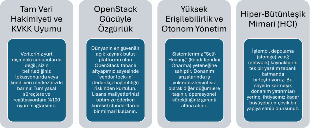 2. OpenStack Gücüyle Özgürlük Dünyanın en güvenilir açık kaynak bulut platformu olan OpenStack tabanlı altyapımız sayesinde “vendor lock-in” (tedarikçi bağımlılığı) riskinden kurtulun. Lisans maliyetlerinizi optimize ederken küresel standartlarda bir mimari kullanın.