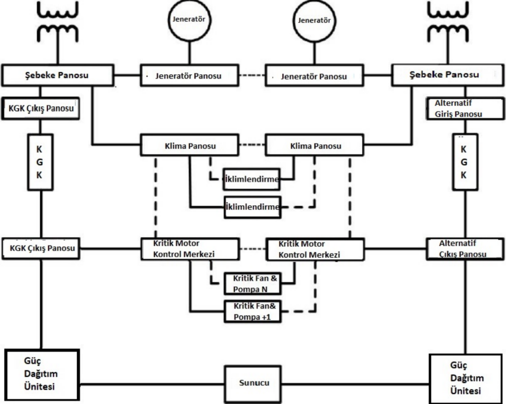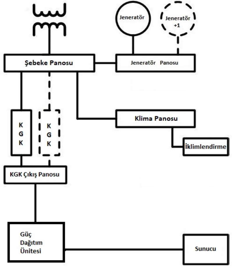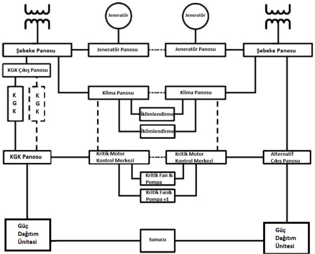 | Enerji Kaynağı | Ana dağıtım ekipmanına tek yol, tek kaynak | Ana dağıtım ekipmanına tek yol, yedekli kaynaklar | Ana dağıtım ekipmanına çoklu yol, yedekli kaynaklar | Ana dağıtım ekipmanına çoklu yol, çoklu kaynaklar |
