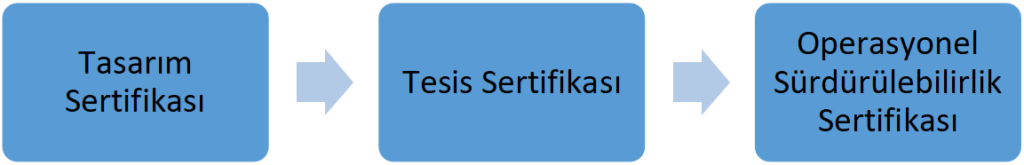 Veri merkezinin Uptime Institute tarafından belirlenen Tier seviyesine göre sertifikalandırılması kapsamında Şekil 6’da gösterilen süreçte danışmanlık hizmetleri sunulmaktadır. İlk aşamada veri merkezinin elektromekanik tasarımı, veri merkezi işletmecisi tarafından yapılarak dokümante edilir. Kapasite planları, mimari ve teknik çizimler hazırlanır. Teknik dokümanların Uptime Institute tarafından incelenmesi sonrasında belirlenen seviyeye göre Tasarım Sertifikası (Certification of Desing Documents) verilmektedir. Tasarım sertifikası alındıktan sonra veri merkezi, onaylanan dokümanlara sadık kalınarak inşa edilir. Tüm altyapı çalışır hale getirildikten sonra, UI danışmanları eşliğinde, veri merkezinin tasarım dokümanlarına uyumluluğu kontrol edilerek, yedeklilik senaryoları çalıştırılır. BT yüklerini simüle edebilmesi amacıyla ısıtıcılar kullanılarak hem elektrik, hem de iklimlendirme kapasitesinin ölçümlenmesi sağlanır. Başarılı yedeklilik testleri ve doküman kontrolü neticesinde Tesis Sertifikası (Certification of Constructed Facility) düzenlenir. Veri merkezinin işlerliği ve sürekliliği insanlara ve süreçlere bağlı olduğu düşüncesinden hareketle, üçüncü sertifikasyon aşaması olarak Operasyonel Sürdürülebilirlik Sertifikası (Certification of Operational Sustainability) düzenlenir.