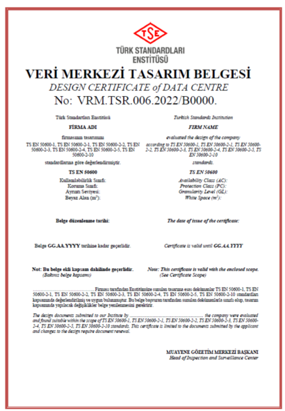 - Tasarım Belgesi: TS EN 50600-1 ve TS EN 50600-2-x standart serilerine ilişkin denetlemeler başarılı sonuçlandığı takdirde “TSE Veri Merkezi Tasarım Belgesi” süresiz olarak verilmektedir.
