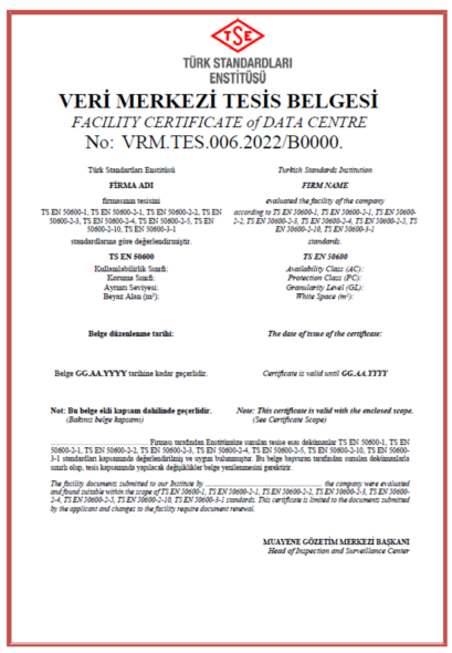 - Tesis Belgesi: Bir veri merkezi tesisinin inşası esnasında tasarıma uygunluğunun fiziksel olarak yerinde denetlenmesi süreci; tasarım dokümanları, tasarım değerlendirme raporları, TS EN 50600-2-x serisi ve TS EN 50600-3-1 standardının ilgili bölümlerinin incelenmesi ve sürecin olumlu sonuçlanması durumunda “TSE Veri Merkezi Tesis Belgesi” süresiz olarak verilmektedir.