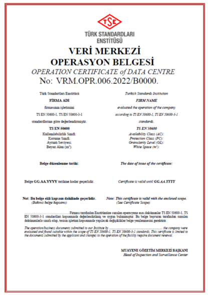 - Operasyon Belgesi: Tesis inşaatı tamamlanarak faaliyete geçmiş veri merkezlerinin operasyon süreçlerinin yerinde denetimi TS EN 50600-3-1 standardının ilgili bölümlerinin incelenmesi ve denetim sürecinin olumlu sonuçlanması durumunda “TSE Veri Merkezi Operasyon Belgesi” verilmekte ve yıllık olarak ara kontroller gerçekleştirilmektedir.