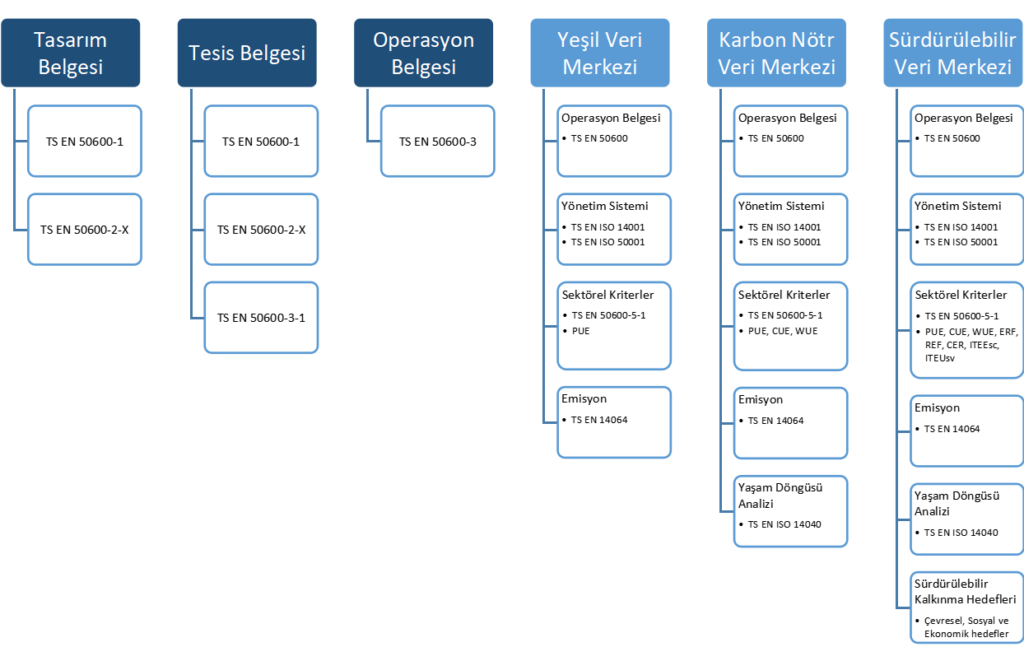 TSE Belgelendirme Programı kapsamında veri merkezinin verimlilik durumunu belgelendiren mekanizmalar da bulunmaktadır. Veri merkezinin Tasarım ve Tesis belgelendirmesi olmasa dahi, Operasyon Belgesi’ne (TS EN 50600) ilaveten, diğer gereksinimlerin Şekil 16’da belirtildiği aşağıdaki belgelendirmeleri de alabilmektedir: