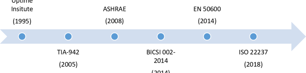 Veri merkezi altyapısına ilişkin geliştirilen standartların tarihsel sıralaması Şekil 1’de yer almaktadır. Her standart, veri merkezi tasarımı ve işletiminin farklı yönleri için özel yönergeler ve öneriler sunar.